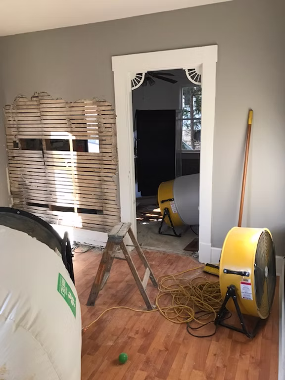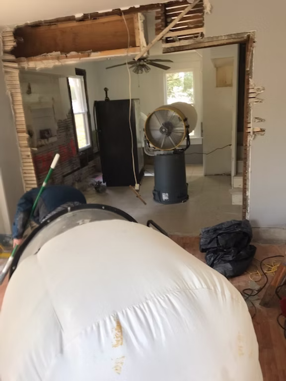 We deployed 2 fans, moving a total of 22,000 cubic feet of air per minute thru the filters based on motor speeds. When we dropped a large section of wall, we learned to step out of the building. And let the dust filters do their work. In a very short amount of time, the clouds of dust are gone. We quickly learned to leave the fans running non stop.